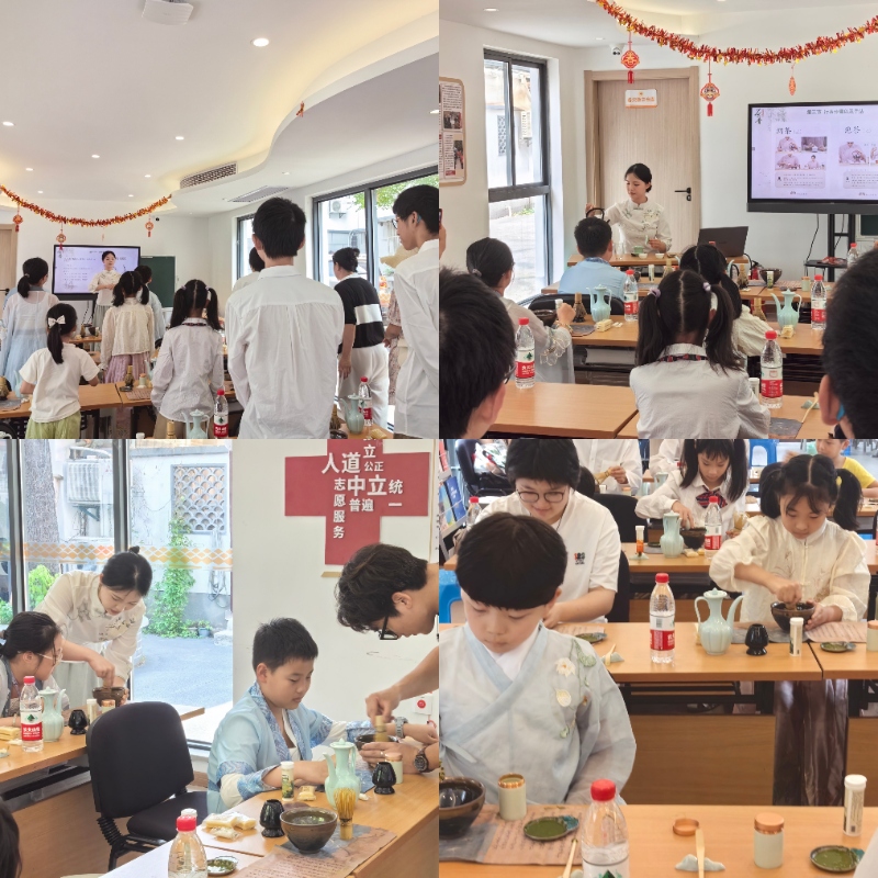 活动中,茶艺师授讲和示范结合,为青少年们揭秘点茶这一古老而神秘的茶艺形式。她详细讲解了点茶的历史渊源、所用器具以及独特步骤,让青少年们对这一传统技艺产生了浓厚的兴趣。茶艺师用调好的茶膏在泡沫上画出党徽、党旗等图案,在孩子们心中播下了红色精神的种子。在茶艺师的帮助和指导下,青少年们兴奋地参与到点茶实践中来。通过亲手研磨茶粉、调制茶汤、轻拂茶沫,他们不仅感受到了点茶的技艺之美,更深刻体会到了茶文化的博大精深和独特魅力。